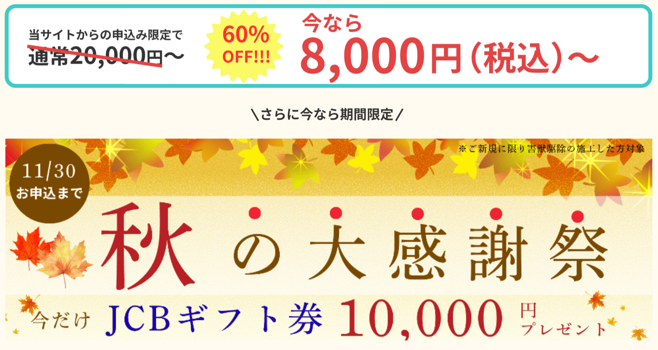 今なら最大で20%オフキャンペーンを実施しているお得な業者もありますよ!